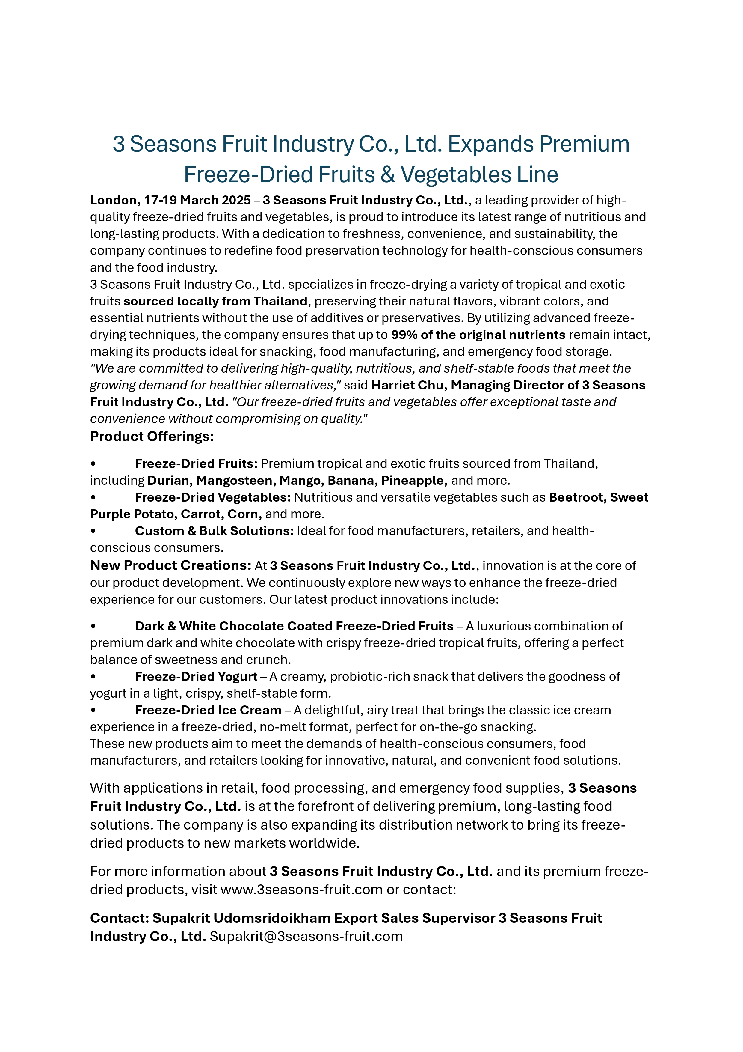Is a leading manufacturer to produce high quality tropical fruits and vegetable processing to be frozen, freeze dried and freeze dried powder using modern technology facility. our products are cerified : BRC, SMETA, HACCP, ISO22000, GMP, HALAL, EU AND USDA ORGANIC.