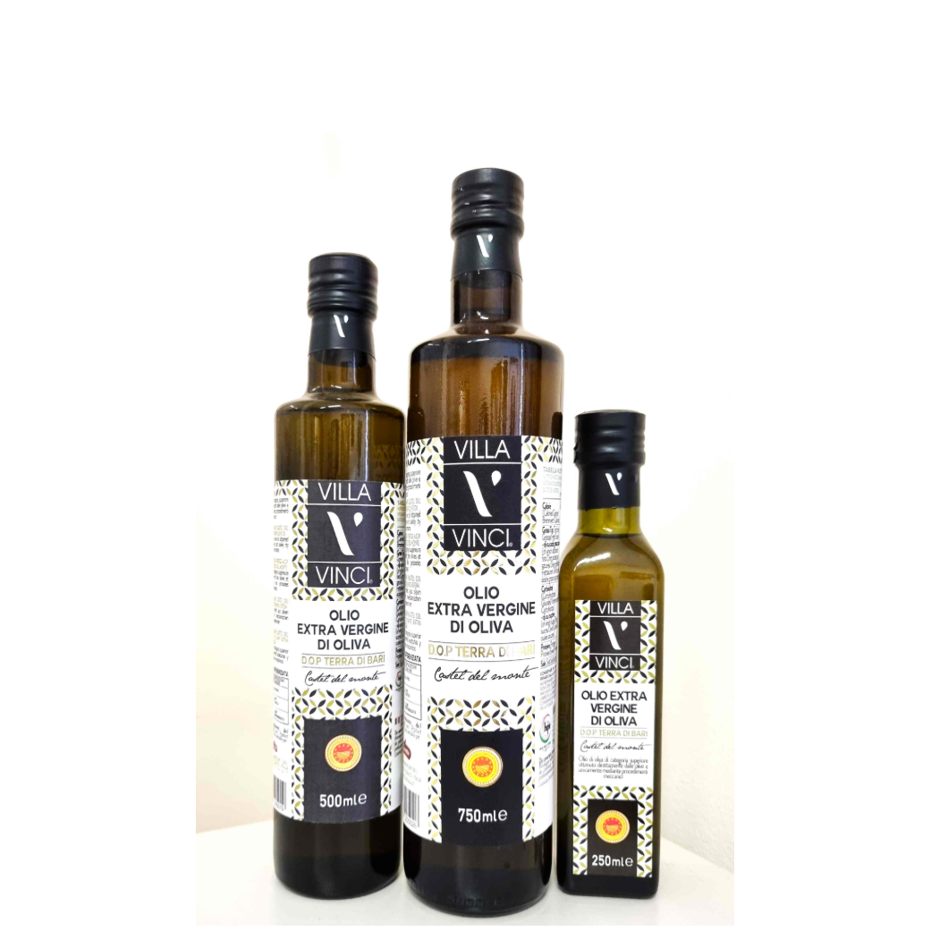 VILLA VINCI 100% Italian Cold Extracted Extra Virgin olive oil is a meticulous selection of the best extra virgins obtained by Apulian olives squeezed in 24 hours after crop. It has an acidity below 0,4%, medium-fruity taste and intense yellow/green colour. It is the best seasoning to enhance salads, vegetable and legumes, grilled meat and all traditional Italian and Apulian main courses.