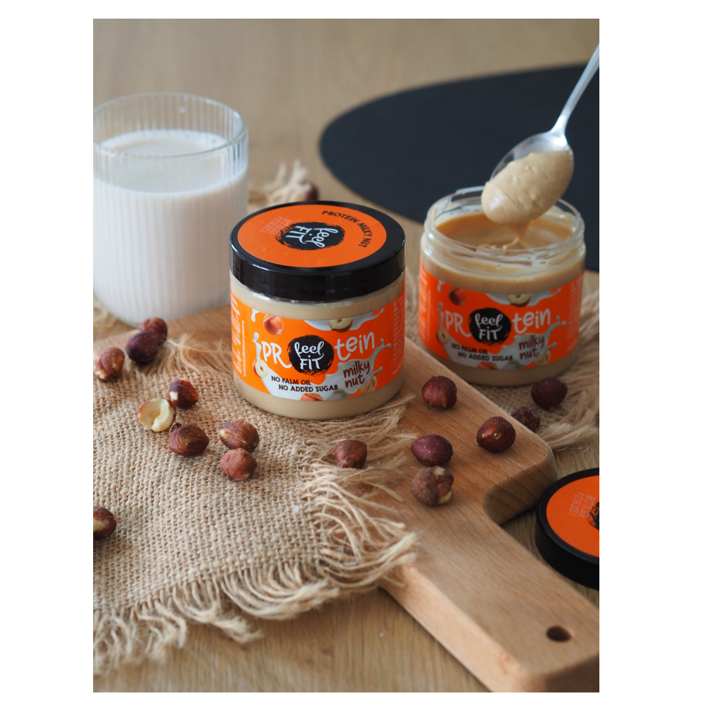 Feel FIT Protein Milky Nut is a creamy, protein-rich hazelnut milk spread created for those who want a sweet in a more balanced and nutritious form. Its silky texture and naturally rich nut taste bring a sense of indulgence while still fitting perfectly into a healthy lifestyle.