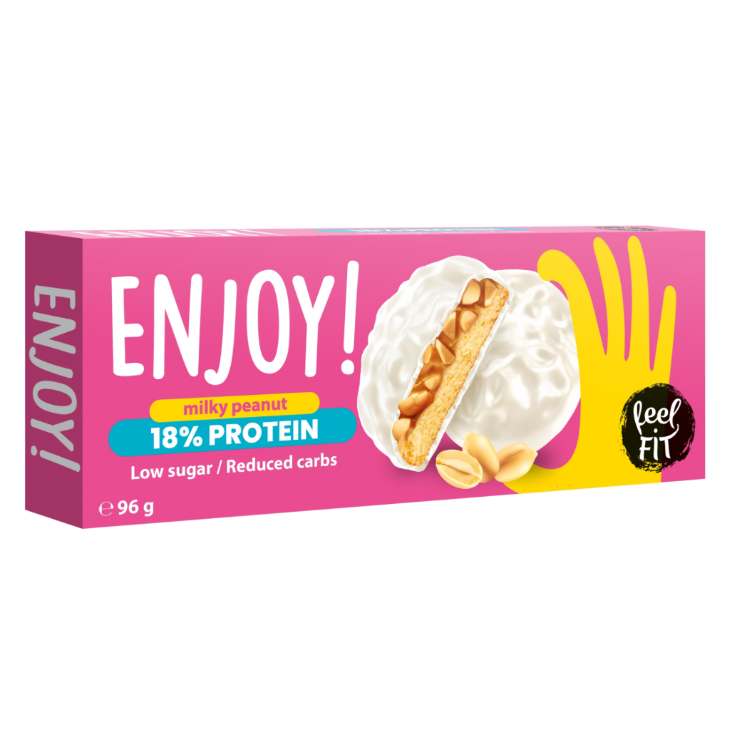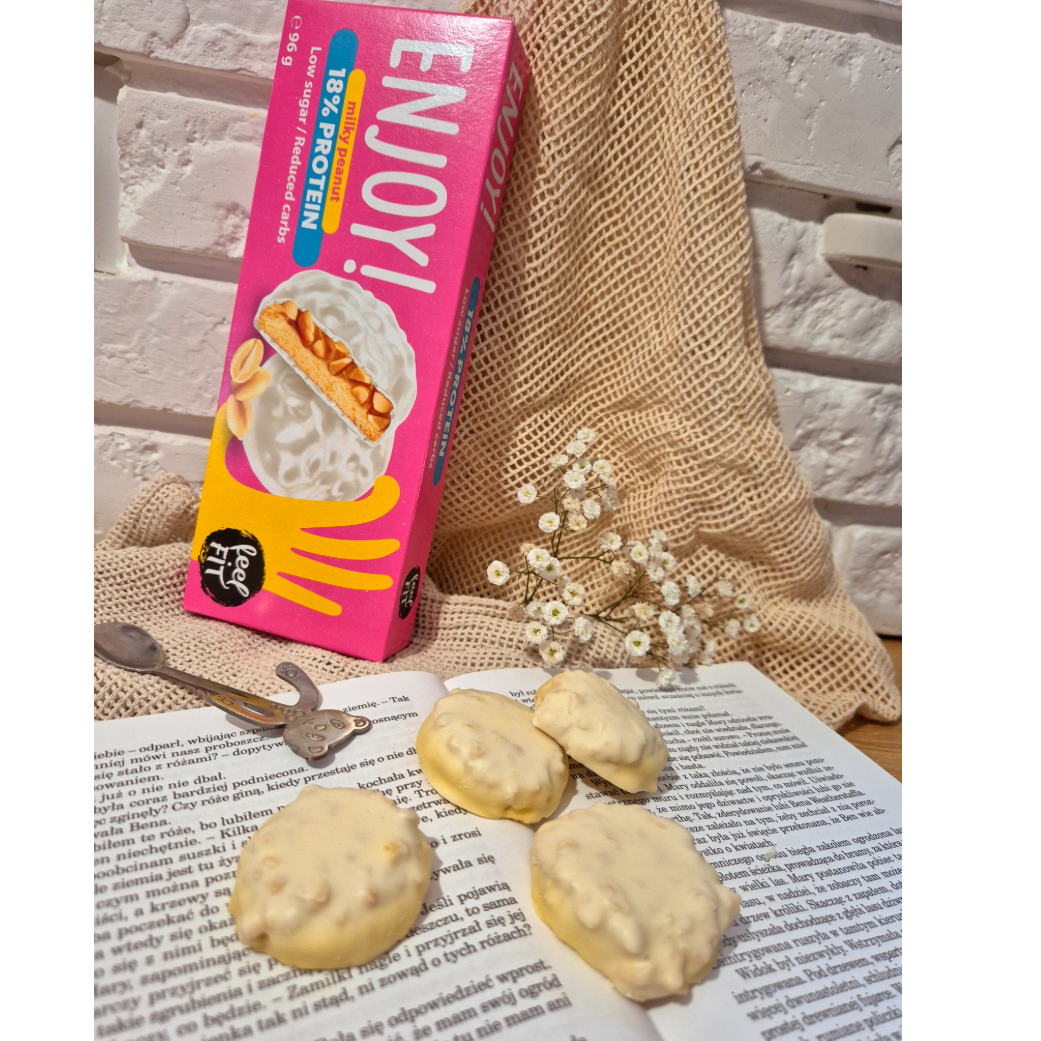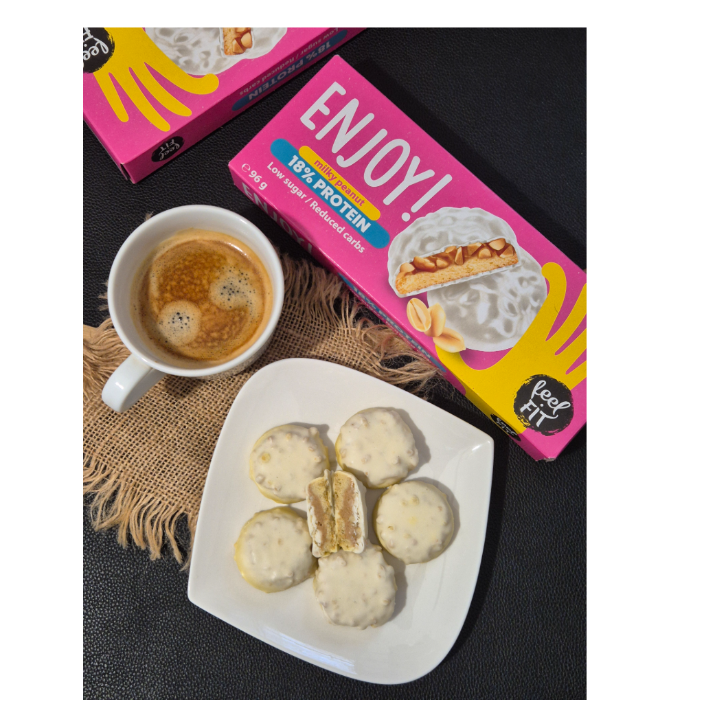 Feel Fit Enjoy! Protein Milky Peanut Cookies combine taste with balanced nutrition. Each cookie features a nutty protein cream filling, crunchy peanuts, and a creamy milky glaze, delivering a rich flavour without added sugar or palm oil.