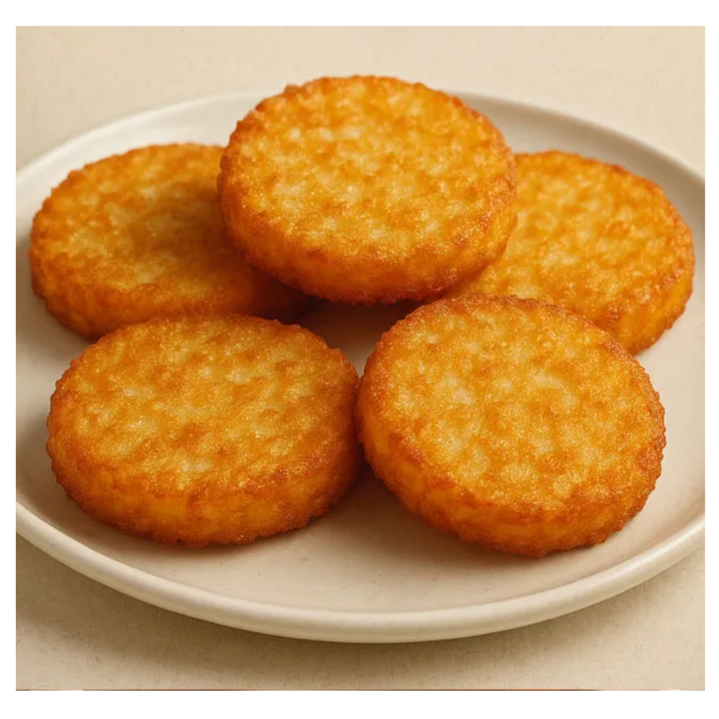 Perfectly Portioned: Golden Round Hash Browns Start your day with our perfectly shaped round hash browns. These delightful, bite-sized discs offer consistent cooking for a flawless golden brown every time. Premium shredded potatoes are used to maximize texture, delivering a deeply satisfying crunch on the outside and a soft, fluffy center. Ideal for any breakfast plate, these hash browns offer a charming and convenient twist on a classic.