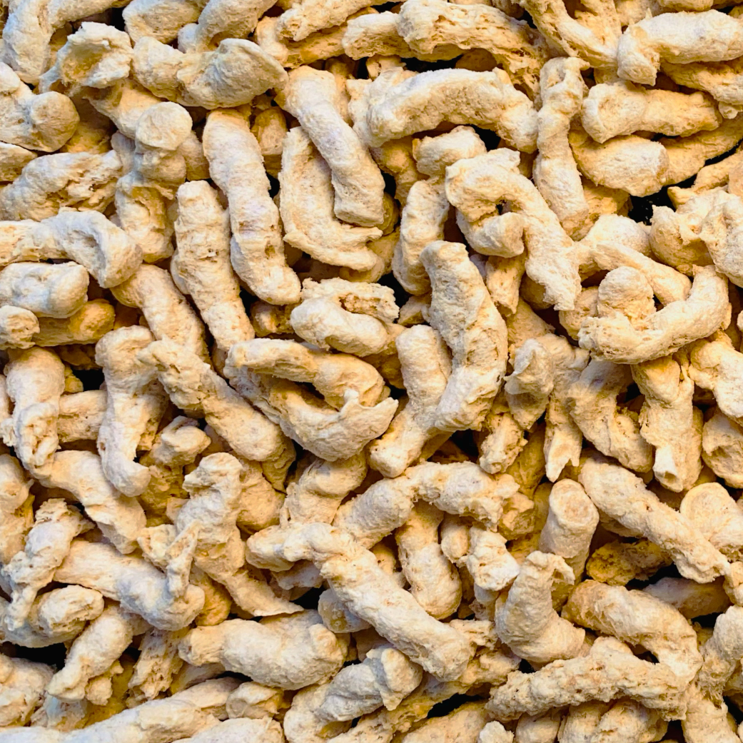 When rehydrated, the product expands efficiently and delivers a fibrous, juicy texture that closely mimics traditional minced meat, providing a satisfying bite and chew. The structure consists of short, twisted and porous strands with an irregular, curly surface, forming soft, meaty fragments after hydration.