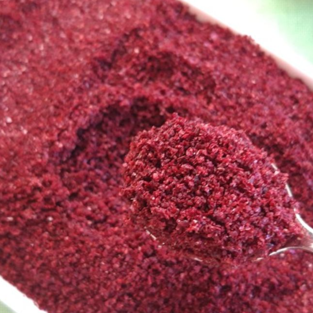 reddish-purple spice from dried, ground berries of the Rhus plant, known for its tangy, lemony flavor, adding a sour taste to Middle Eastern and Mediterranean dishes, used on meats, salads, and dips.