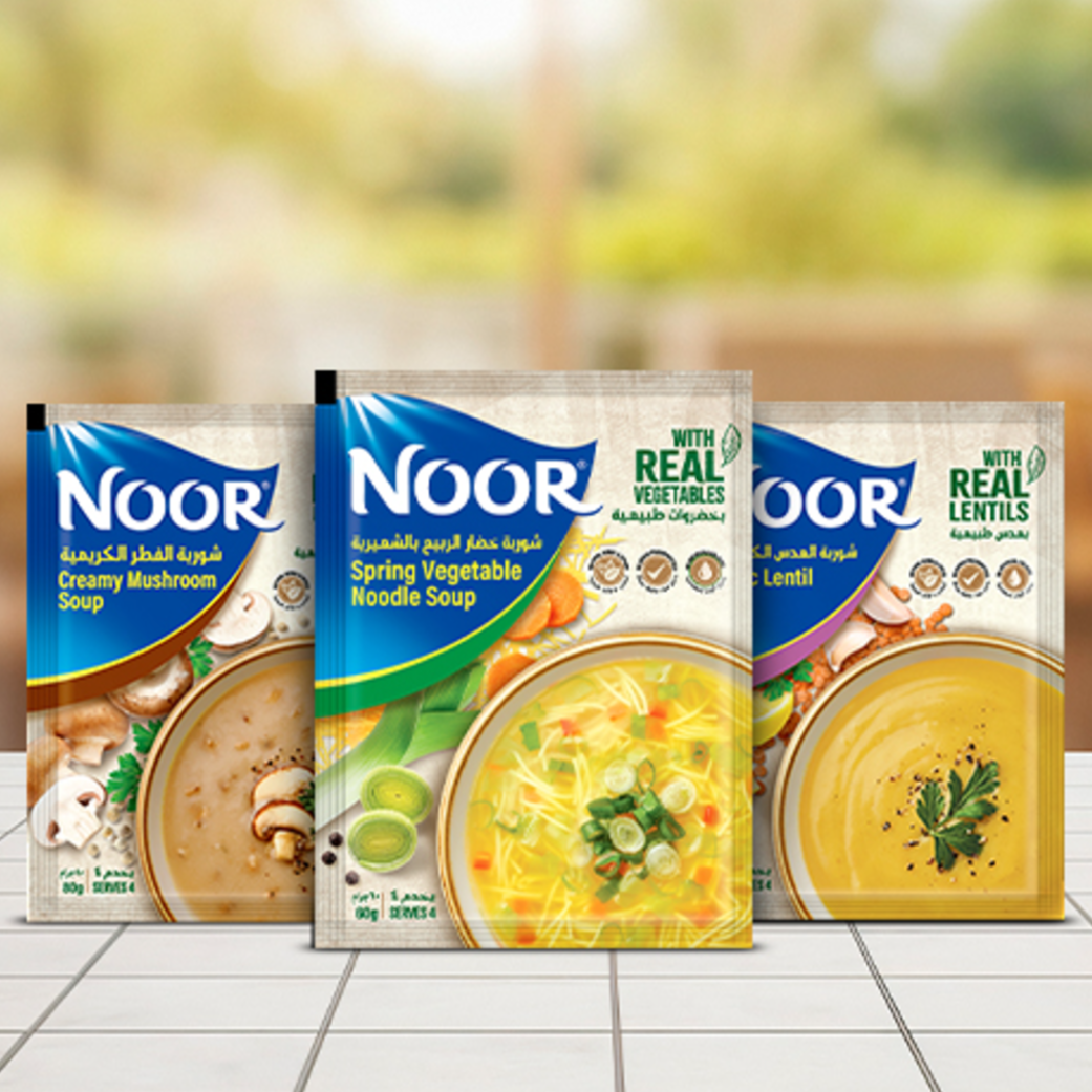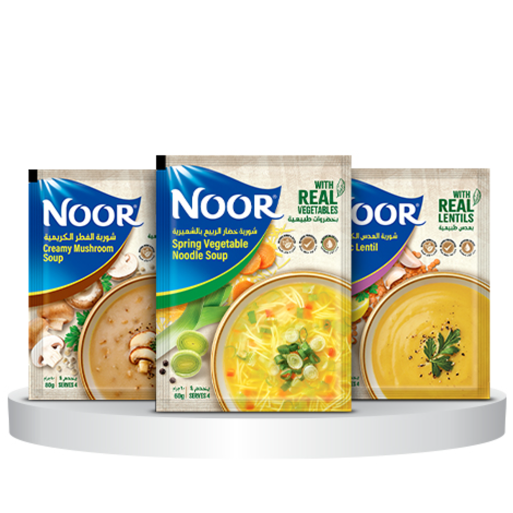 Noor Soups offer a comforting, ready-to-serve range in eight exciting variants including Chicken Noodle, Chicken Noodle Ginger, Vegetable, Kids Pasta, Creamy Mushroom, Lentil, Cream of Chicken, and 11 Veg, crafted for great taste and everyday convenience. Made with carefully selected ingredients, they deliver balanced flavor and satisfying texture in every bowl. Ideal for quick meals, light lunches, or wholesome snacks, Noor Soups can be enjoyed on their own or paired with bread and sides.