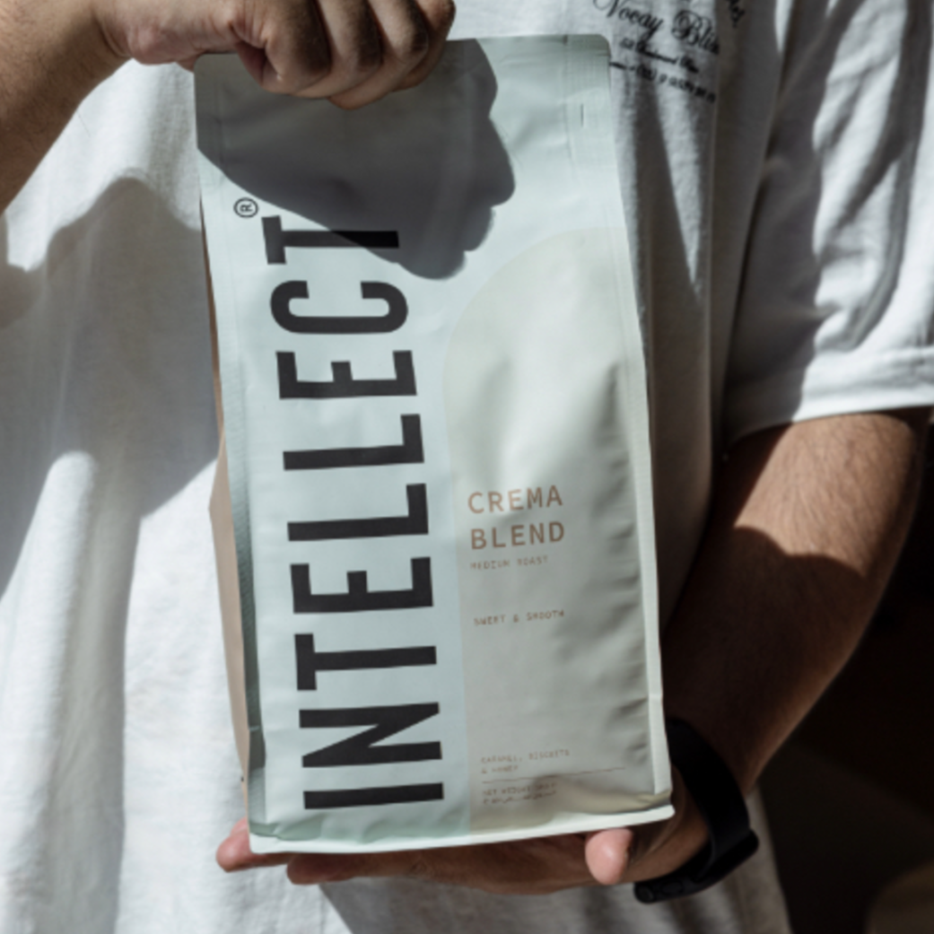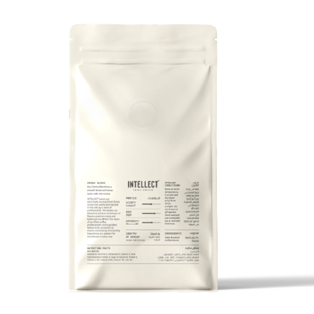 Our CREMA Blend delivers a smooth, balanced honey sweetness with a rich, velvety crema. INTELLECT beans are selectively hand-picked from partner farms and expertly roasted in the UAE. Each blend is carefully designed to achieve harmony of flavor, premium taste, and a balanced mouthfeel. All our products follow strict quality protocols and undergo a rigorous tasting process developed by our Head of Coffee, World Coffee Champions, Q-graders, and licensed coffee professionals. Experience our passion for excellence in every cup.