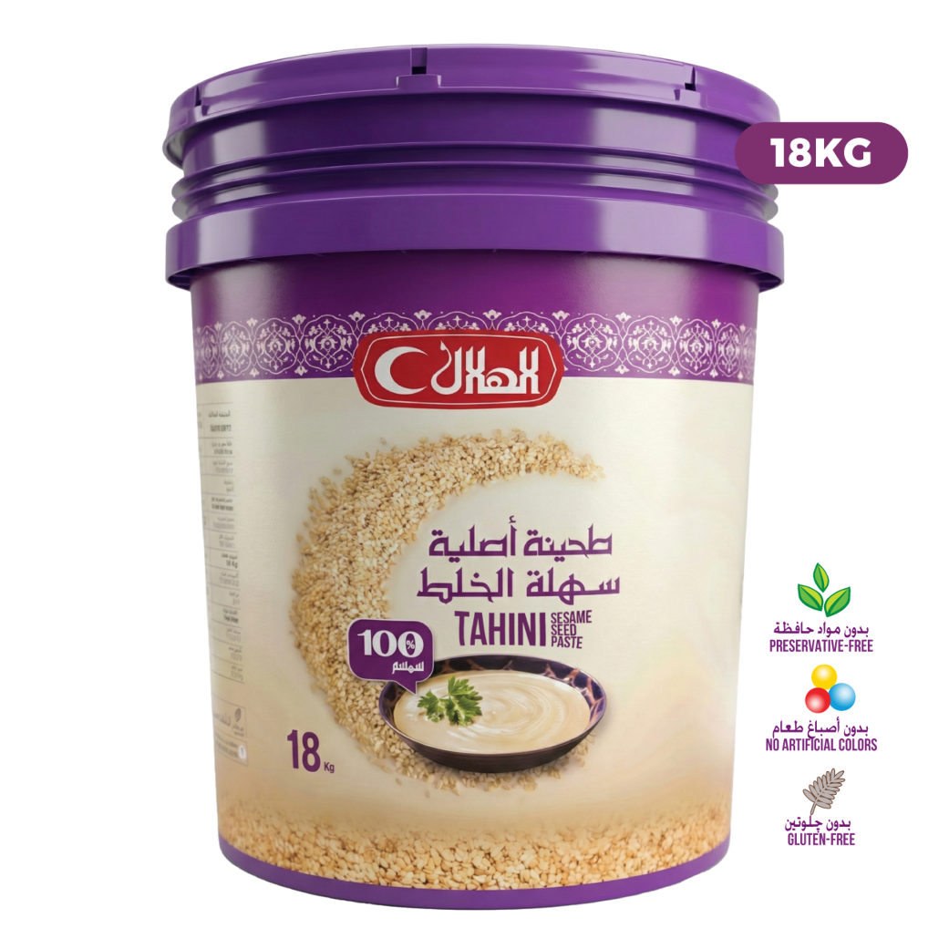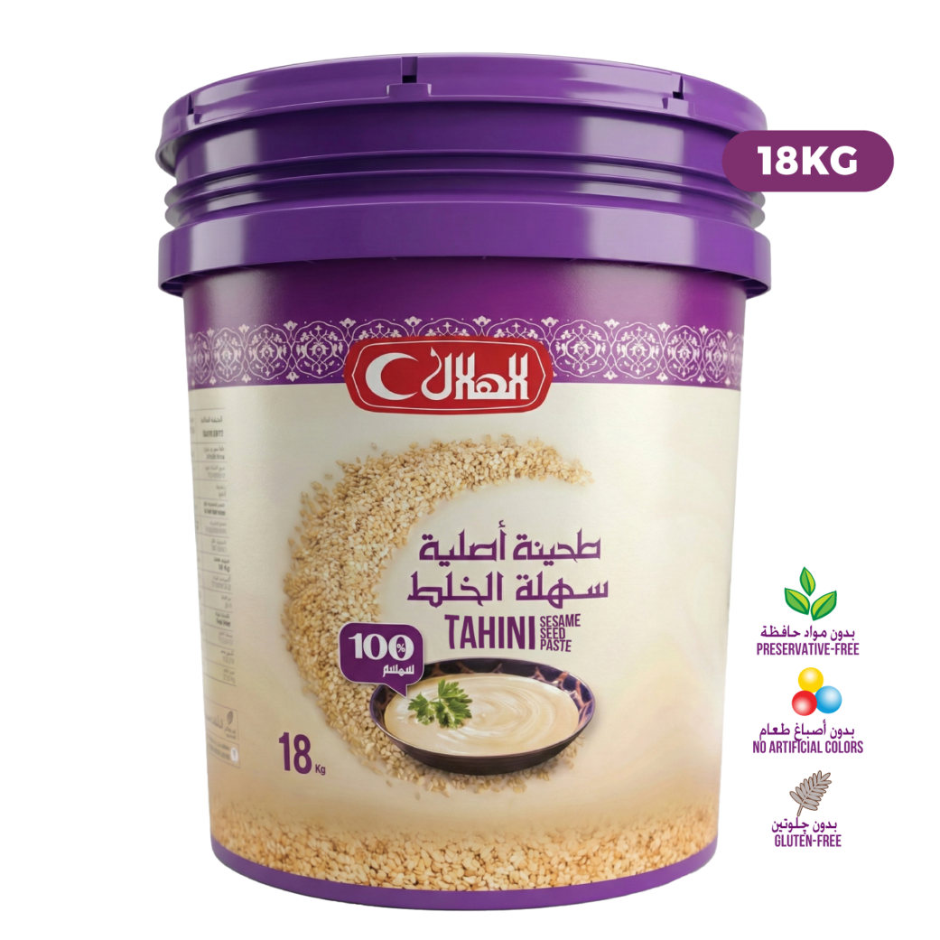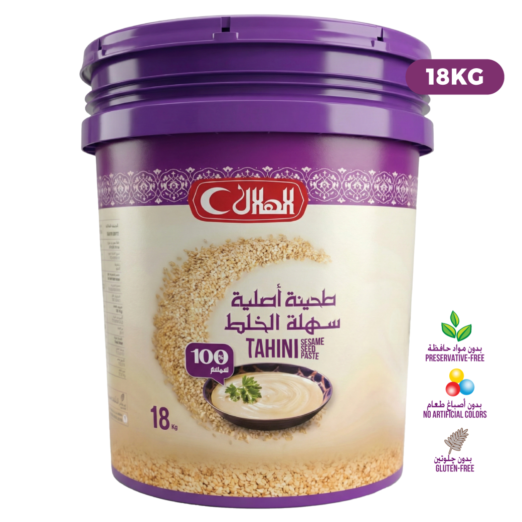 ALHELAL Tahini Bucket – 18 kg is manufactured using high-quality sesame seeds and advanced sesame processing technology to ensure consistent texture, stable performance, and dependable quality.