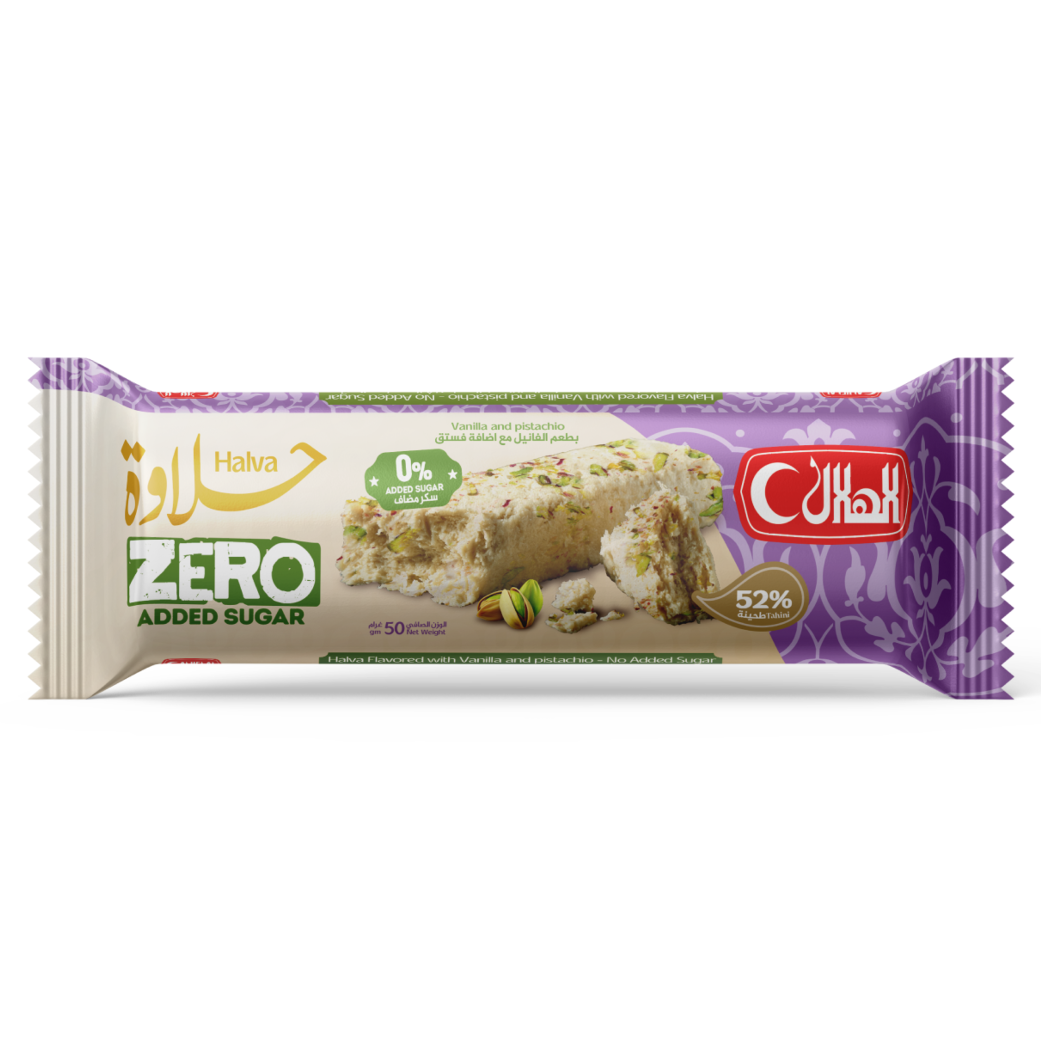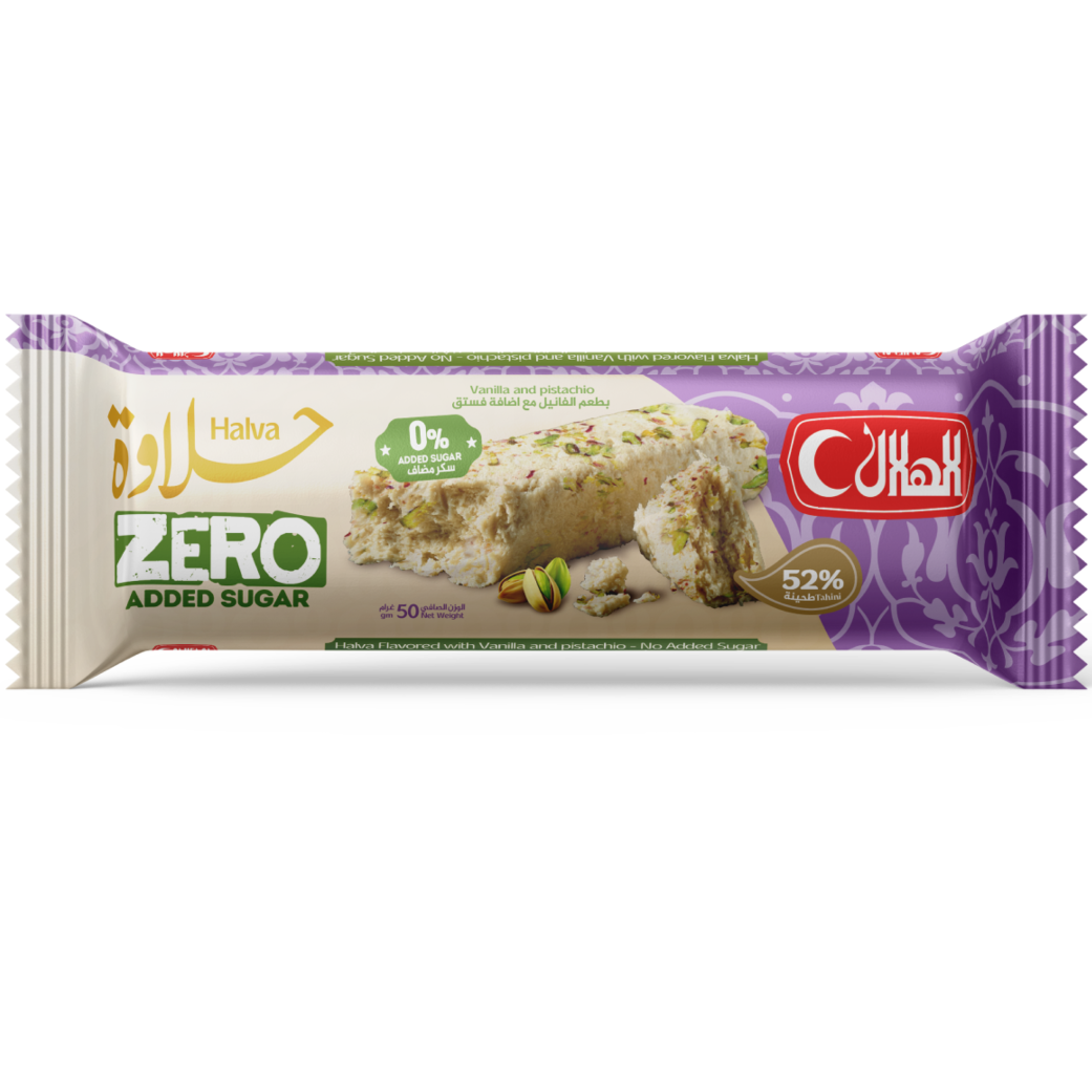 ALHELAL Vanilla & Pistachio Halva Bar is crafted using high-quality tahini, blended with natural vanilla flavor and pistachio pieces, with no added sugar. This convenient 50 g bar provides a rich yet balanced snack option, maintaining the authentic halva experience while meeting modern dietary preferences. Suitable for global FMCG distribution, on-the-go consumption, and health-focused retail segments. Key Features: No added sugar Vanilla & pistachio flavor Made with premium tahini Individually wrapped 50 g bar Suitable for international retail markets