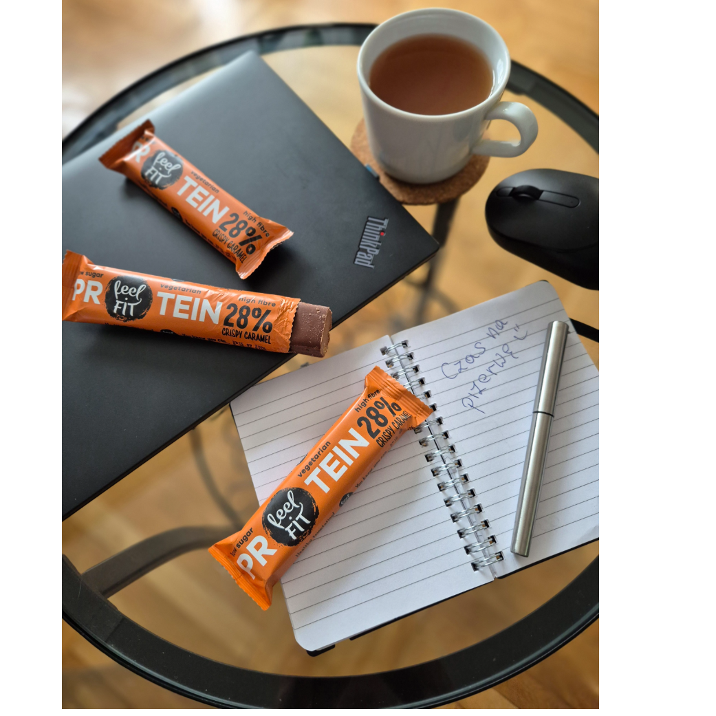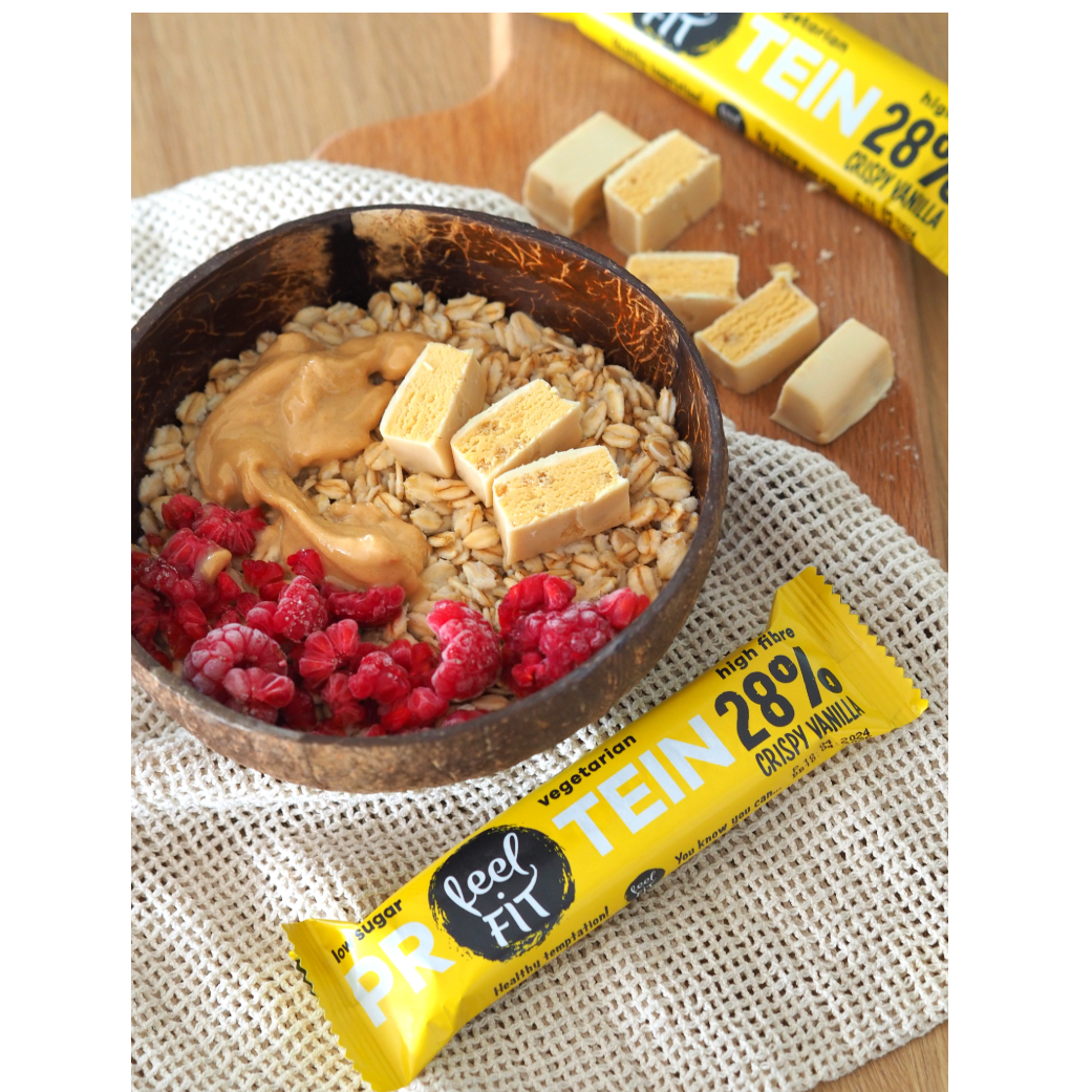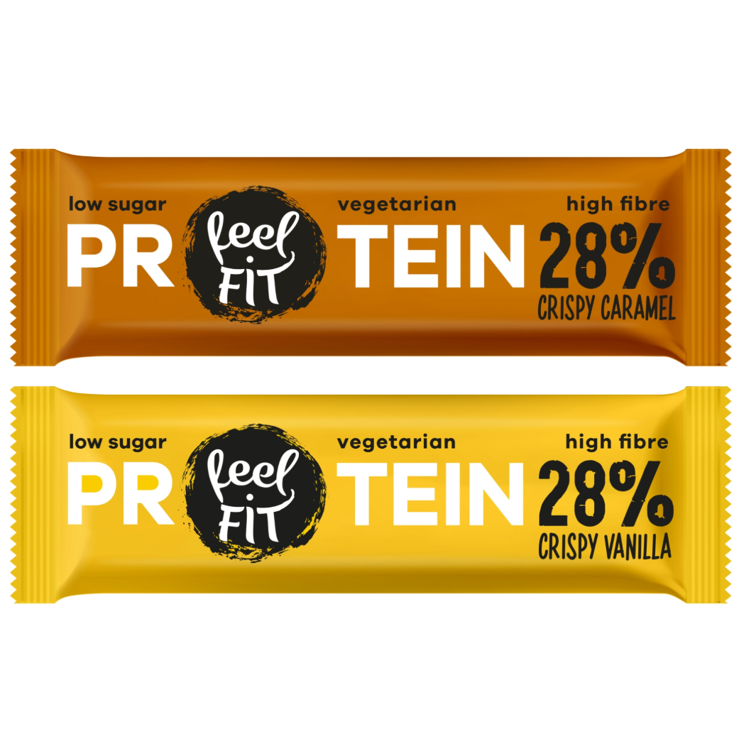 Feel FIT Protein Crispy bars are modern protein snacks designed for active people and for those who care about a healthy, balanced diet. They stand out with a high protein content of 28% and a low sugar level, with no added sugars, making them an excellent alternative to traditional sweet bars. The Crispy Caramel variant delights with an intense caramel flavor covered in a cocoa glaze, perfect for caramel lovers who value both taste and nutrition. It contains only 2 g of sugars naturally occurring from other ingredients. Its unique formula is based on a blend of proteins: milk protein, soy protein, providing effective support for muscles and recovery. The bars are produced in accordance with the IFS standard in a company with a long tradition in protein bar manufacturing, ensuring premium quality. The Crispy Vanilla variant combines a pleasant vanilla flavor with a white chocolate yogurt coating. It contains only 1,6 g of natural sugars and provides 11,2 g of protein per bar, making it a filling and functional snack at any time of the day. It is a 100% vegetarian product, free from animal-derived ingredients,. A high fiber content further supports digestion and long lasting satiety. Feel FIT Protein Crispy bars are a perfect choice for athletes as well as for anyone looking for a healthier alternative to sweet snacks, without compromising on taste.